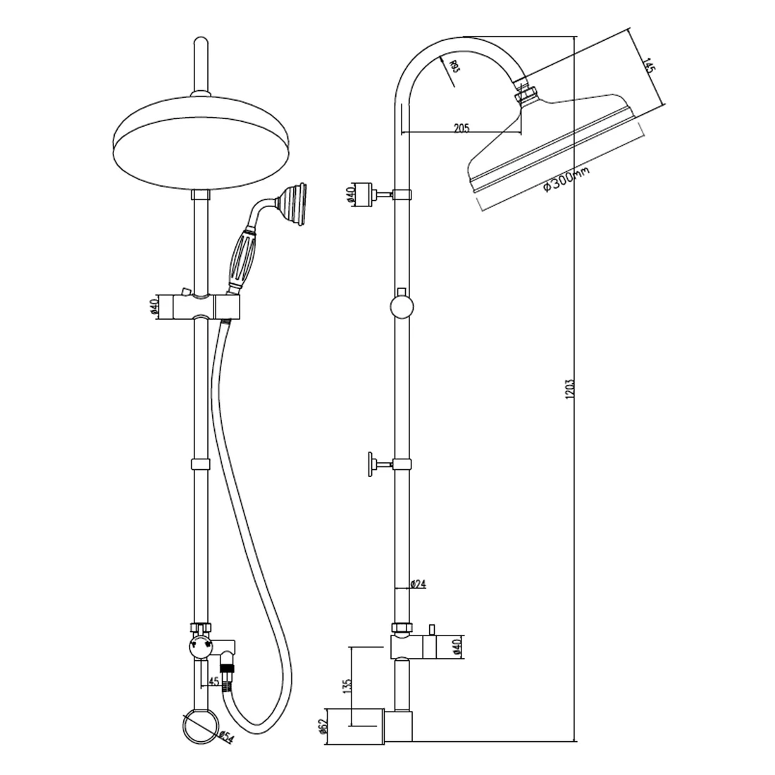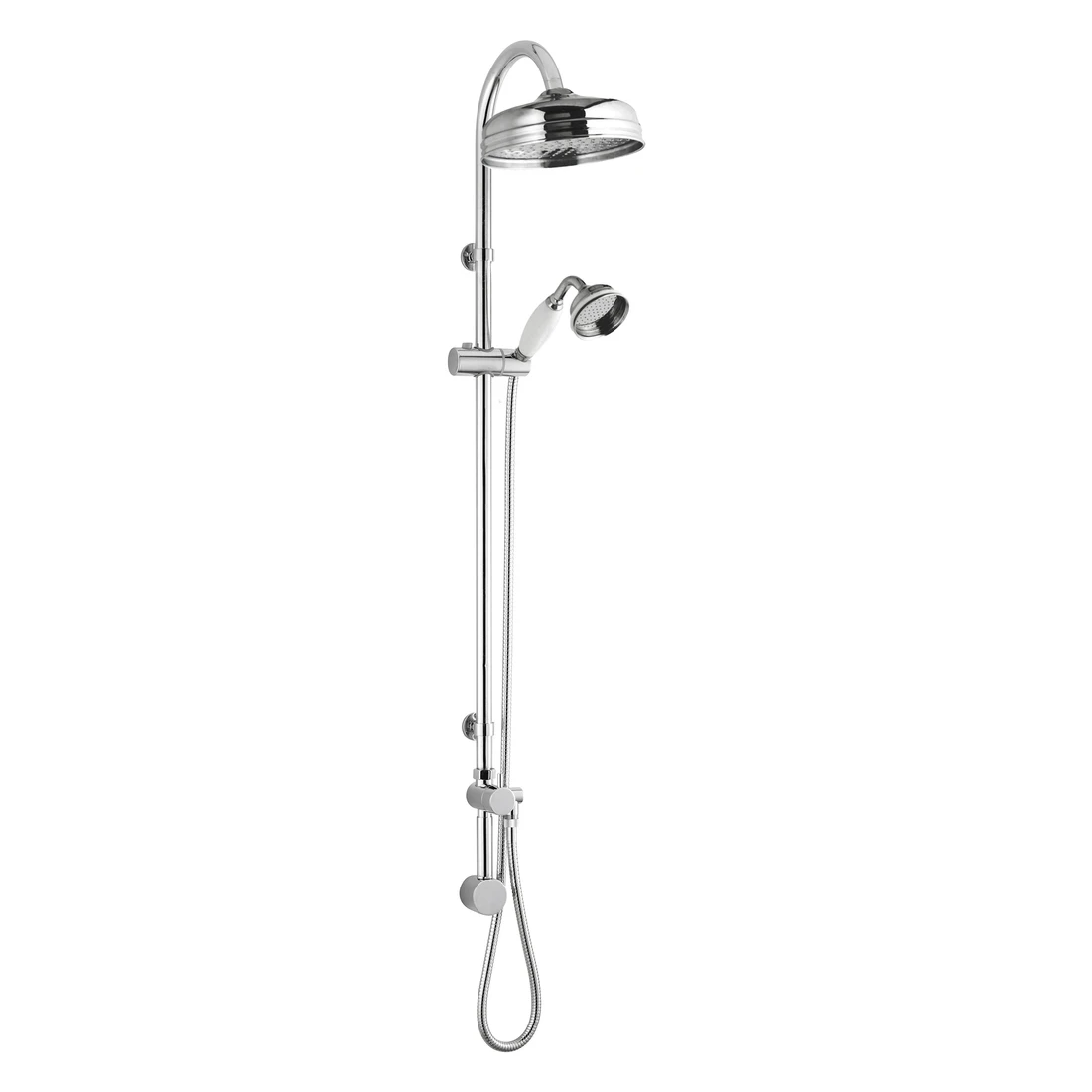 Includes round shower head and handset with white ceramic detail and concealed elbow