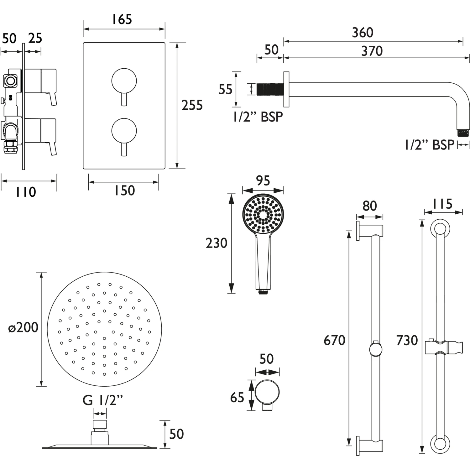 Shower kit with an adjustable riser rail, multi function handset and outlet