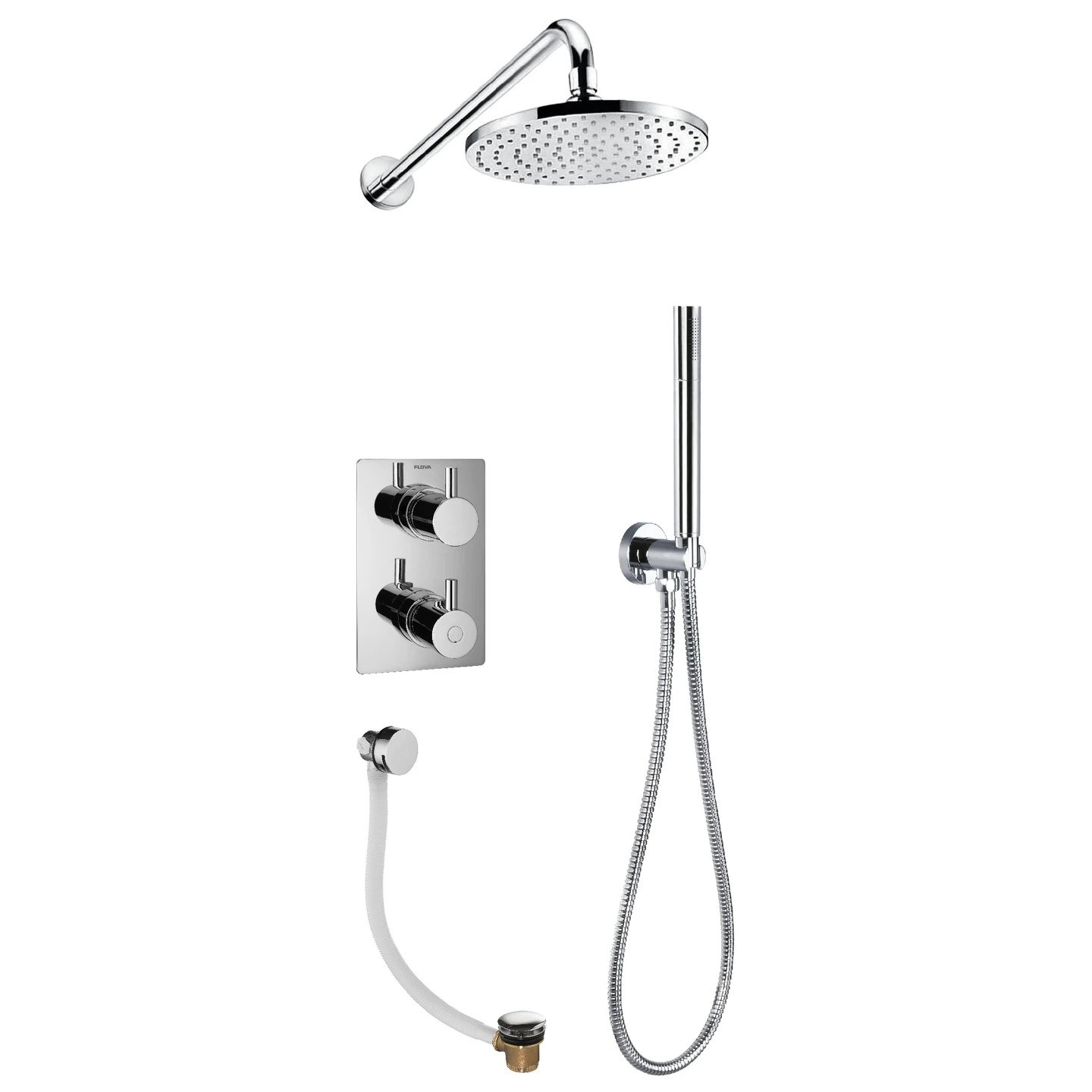 Levo thermostatic 3-outlet shower valve with fixed head, handshower kit and bath overflow filler, Square