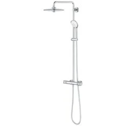 The Euphoria 260 shower system is a pleasure to use thanks to the ergonomic handles and cutting edge Grohe technology. Precise operation is intuitive using the Grohe ProGrip handles with textured surface – even with soapy hands. Set your favourite temperature with Grohe TurboStat and the water will stay just how you like it, even if the supply fluctuates. Safety is guaranteed as Grohe 100% CoolTouch ensures the entire thermostat body never gets too hot so there is no risk from scalding. The easy-to-use Grohe SafeStop feature limits the water temperature to a maximum of 38°C – great for giving children independence in the bathroom – but can be raised for adults by unlocking the handle via the button. The AquaDimmer’s handle lets you effortlessly control the volume of water while also directing the flow of water between the head and hand shower. Grohe DreamSpray means the flow of water from every nozzle of the head and hand shower is even, and the silicone SpeedClean nozzles are easy to keep free of dirt and limescale. The 260mm Euphoria head shower has a 450mm swivel arm. Enjoy the luxury of 3 spray zones: simply turn the button in the centre of the spray plate to select the spray zone that perfectly matches your mood. The powerful and focused Jet spray is ideal for an invigorating head massage or washing out shampoo; the SmartRain spray is wider for a revitalizing yet relaxing shower; and the all enveloping Rain spray uses all the nozzles on the 260mm spray plate for full body coverage and a truly soothing experience. The Euphoria 110mm massage hand shower, which comes with a 1750mm twist-free SilverFlex hose and gliding element, also has three great sprays: soft rain, water-saving SmartRain and the powerful massage spray. For both showers, Grohe EcoJoy limits the water flow to 9.5 l/min but still delivers pure and satisfying indulgence. The multilayered coating of scratch resistant Grohe StarLight chrome has a sparkle that lasts for years. Thanks to Grohe FastFixation, it can be installed easily using existing an drill hole as the upper bracket is adjustable.