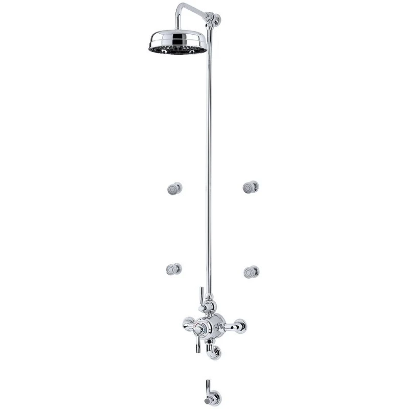 Exposed Thermostatic Valve with Lever Handles, Secondary Outlet, 1000 Riser 90°, 8″ Shower Rose, 4 x Body Sprays & Single 3/4″ Wall Valve Lever